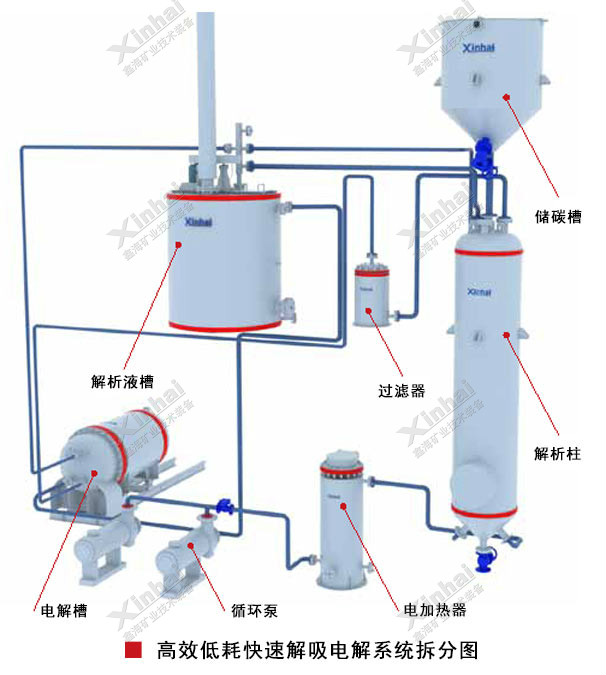 为了更好的用氰化法从载金炭中提取固体金。乐思体育生产了一套在高温高压条件下经解吸、电积从载金炭获得金泥的高效低耗快速解吸电解装置,本装置将解吸和电解的过程分开,使溶剂在综合解吸塔内进行,贵液电解则在独立的电解池内完成,将溶剂解吸、贵液加热、溶剂冷凝及溶剂回收四个工序集中设置在综合解吸塔内,而将溶剂蒸汽解吸载金炭后获得的贵液,通过管道导入独立设置的电解槽进行电解,得到粗金,再经过提纯得到成品金。在此过程中,浸出搅拌槽的矿浆是在双叶轮的拖动与搅拌作用下,在中心由上至下流动,经周边的阻尼板进行扩散,在轴的下端给入空气,与矿浆进行混合并向上循环,形成均匀的悬浮混合液。浸出搅拌槽因其搅拌强度适中,槽内矿浆浓度、细度分布一致,可提高氰化的浸出率和炭的吸附率。