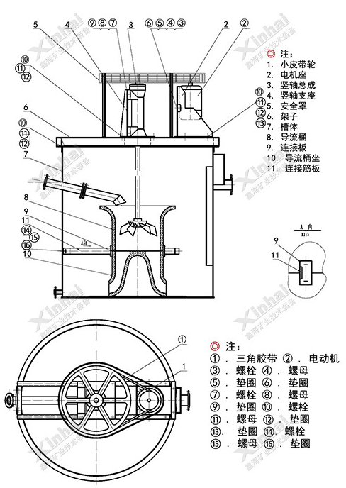 搅拌槽主要由竖轴部、架子、槽体、导流筒、溢流口、连接板、安全罩、电动机、电动机座组成。在浮选过程中搅拌槽工作时,矿浆会在叶片叶轮的旋转作用下,沿轴向从叶轮下端排出,在叶轮腔形成负压,使矿浆从叶轮上面流入叶轮腔进行补充。之后由电动机通过皮带轮和三角带来带动叶轮的旋转使矿浆和药剂搅拌均匀,通过提升装置将混合液从排料斗流出。于此同时,在稳流板的导流作用下,矿浆在槽内形成中心向下、四周向上的垂直循环流。当矿浆的上升流速度大于矿粒的沉降速度时,矿浆中的矿粒便呈悬浮状态,并保持均匀的浓度。如此反复循环,实现搅拌作用。